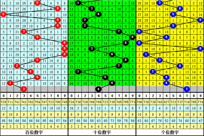 3、在以上0-9号码频次中,号码大小比为38:30,012路比为24:20:24,本期展望百位开出0路号码,参考号码3。