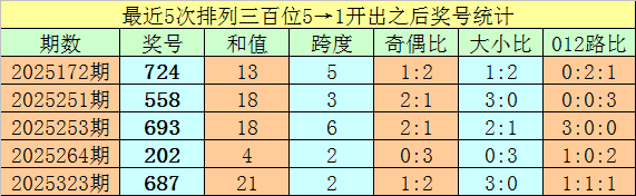1、胪列三最近两期百位号码辞别开出5和1,历史上百位号码集中两期辞别开出5和1的奖号出现了69期。前五期开出之后其下期奖号辞别为:724、558、693、202、687;