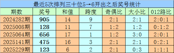 1、最近两期胪列三十位号码开出号码辞别为5和6,历史上十位号码集中两期同期出现号码5和6的奖号共开出75期。最近五次下期开出号码为:905、128、656、475、123;